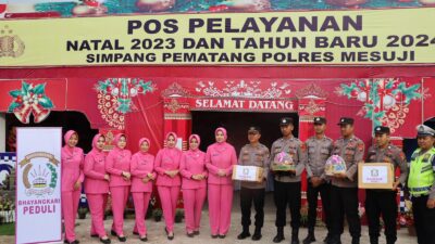 Mesuji | Pojokdesa.co.id – Kapolres Mesuji Bersama Ketua Bhayangkari Cabang Mesuji Kunjungi Pos Pam dan Pos Yan Sebagai Wujud Keperdulian Kepada Petugas Pam* Polres Mesuji – Menghadapi libur Natal 2023 dan Tahun Baru 2024, Kepolisian Republik Indonesia khususnya Polres Mesuji Polda Lampung melaksanakan Operasi Kepolisian dengan sandi Ops Lilin Krakatau 2023. Kegiatan Operasi tersebut dilaksanakan dengan mendirikan Pos Pelayanan (Pos Yan) dan Pos Pengamanan (Pos Pam) di beberapa titik keramaian di Kabupaten Mesuji yang bersinergi dengan TNI, Pol PP, Dishub, BPBD, Senkom, Banser dan Pramuka. Dalam Giatnya, Kapolres Mesuji AKBP Ade Hermanto S.H, S.IK, CPHR didampingi Ketua Bhayangkari Cabang Mesuji Ny. Ayu Ade Hermanto bersama Waka Polres Mesuji Kompol Juli Sundara bersama Ny. Iis Juli Sundara S.Pd, Kasat Lantas Polres Mesuji IPTU Asep Suhendi S.H, M.H bersama Istri dan Pengurus Bhayangkari Cabang Mesuji. Sabtu (30/12/2023). Selain menyambangi, pihaknya juga memberikan Bingkisan makanan dan minuman kepada seluruh Petugas baik Pos Pam maupun Pos Yan. Kapolres Mesuji AKBP Ade Hermanto mengatakan, hal tersebut sebagai bentuk kepedulian terhadap seluruh petugas. “Ini merupakan bentuk kepedulian yang dimana seluruh petugas sudah pastinya lelah bekerja demi Keamanan dan Kelancaran Nataru”. Ucap Alumni Akpol Tahun 2002 tersebut. Dalam kesempatan yang sama, Ketua Bhayangkari Cabang Mesuji juga menyampaikan tujuan kegiatan tersebut. “Ini memang sudah menjadi program Bhayangkari Cabang Mesuji yang merupakan kegiatan Bhayangkari Peduli, yang artinya kita peduli terhadap semua unsur yang juga meliputi petugas Kepolisian dan unsur lain yang bersinergi menjaga keamanan selama pelaksanaan libur Nataru”. Ujarnya. Kapolres bersama Ketua Bhayangkari mengunjungi 5 Pos, yakni Pos Pelayanan Rest Area 234, Pos Pengamanan Pintu Exit Tol Simpang Pematang, Pos Pengamanan Desa Agung Batin Perbatasan Provinsi Lampung dengan Sumatera Selatan, Pos Pelayanan Simpang Pematang dan Pos Pengamanan Perbatasan Kabupaten Mesuji dan Tulang Bawang Barat tepatnya di Simpang Asahan. “Mudah mudahan hal ini dapat membantu pelaksanaan tugas seluruh petugas dan dapat memberi manfaat baik, sehingga petugas dapat bekerja dalam keadaan sehat”. Harapnya (Humas Polres Mesuji).Polres Mesuji – Menghadapi libur Natal 2023 dan Tahun Baru 2024, Kepolisian Republik Indonesia khususnya Polres Mesuji Polda Lampung melaksanakan Operasi Kepolisian dengan sandi Ops Lilin Krakatau 2023.