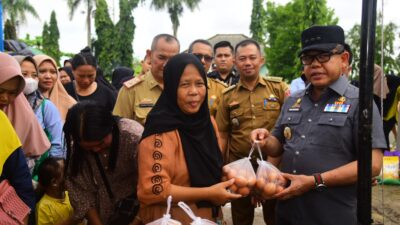 Mesuji | Pojokdesa.co.id : Dalam rangka menghadapi Bulan Suci Ramadan dan Hari Raya Idul Fitri Tahun 2024 Penjabat Bupati Mesuji Dr. Drs. Sulpakar, M.M. meninjau secara langsung Operasi Pasar Murah di Halaman Pasar Rakyat Simpang Pematang, Selasa (05/03/2024). Hadir dalam kegiatan tersebut Staf Ahli Bidang Ekonomi, Pembangunan dan Keuangan Kabupaten Mesuji Sakhroni, S.Sos., M.I.P., Kepala Dinas Koperasi, UKM, Perindustrian dan Perdagangan Kabupaten Mesuji Sunardi, S.E., Kepala Dinas Ketahanan Pangan Kabupaten Mesuji Arif Dwiyanto, S.T., M.T., Kepala Dinas Pertanian Kabupaten Mesuji Pariman, S.P., M.M. dan Undangan. Pada kesempatan tersebut Kepala Dinas Koperindag Sunardi mengatakan bahwa Pemerintah Provinsi menggelar pasar murah di Kabupaten Mesuji dan untuk selanjutnya dilanjutkan oleh Pemerintah Kabupaten Mesuji sampai pada hari Jum’at, 8 Maret 2024 bekerjasama dengan perum Bulog KCP Tulang Bawang. Acara pasar murah yang di gelar pada hari ini merupakan langkah Pemerintah Provinsi Lampung dan Pemerintah Kabupaten Mesuji untuk menekan laju inflasi pada beberapa bahan pokok. Adapun komoditi bahan pokok yang di jual pada pasar murah tersebut diantaranya: Gula pasir, Minyak goreng, Tepung terigu, Telor ras dan Cabe. “Kegiatan pasar murah kali ini terpusat di pasar rakyat Simpang Pematang dan dilaksanakan menjelang ramadan serta menjelang lebaran idul fitri, kegiatan pasar murah pada hari ini dihadiri dan dipantau secara langsung oleh bapak Penjabat Bupati Mesuji Dr. Drs. Sulpakar, M.M. sekaligus beliau menyerahkan secara simbolis kepada pembeli bahan pokok setiap aitem diserahkan secara langsung oleh bapak PJ Bupati,” ujarnya. Pj. Bupati Mesuji juga menjelaskan bahwa tujuan dari Pasar Murah ini adalah untuk memberikan kemudahan pada masyarakat. “Untuk subsidi bahan pokok yg dilaksanakan pada hari ini di subsidi oleh Pemerintah Provinsi langsung dan mulai besok sampai selanjutnya di subsidi oleh Pemerintah Kabupaten Mesuji,” tutupnya.Hadir dalam kegiatan tersebut Staf Ahli Bidang Ekonomi, Pembangunan dan Keuangan Kabupaten Mesuji Sakhroni, S.Sos., M.I.P., Kepala Dinas Koperasi, UKM, Perindustrian dan Perdagangan Kabupaten Mesuji Sunardi, S.E., Kepala Dinas Ketahanan Pangan Kabupaten Mesuji Arif Dwiyanto, S.T., M.T., Kepala Dinas Pertanian Kabupaten Mesuji Pariman, S.P., M.M. dan Undangan.