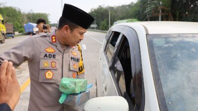 Mesuji | Pojokdesa.co.id : Memasuki Hari ke 4 Bulan Suci Ramadhan, Kapolres Mesuji bersama Pengurus Persatuan Pedalangan Indonesia (Pepadi) membagikan Takjil berbuka kepada pengguna jalan dan Masyarakat yang melintas di Exit Tol Simpang Pematang. “Hari ini Kami dari Jajaran Polres Mesuji bersama dengan Pengurus Pepadi Kabupaten Mesuji melaksanakan Jumat Curhat dengan membagikan Takjil kepada Pengguna jalan dan Masyarakat yang melintas di Pintu Exit tol Simpang Pematang”. Jelas Kapolres Mesuji AKBP Ade Hermanto S.H, S.IK, CPHR, Jumat (15/03/24) Lebih lanjut, selain berbagi Takjil, Alumni Akpol 2002 itu juga memberikan himbauan Kamtibmas dan tertib berlalulintas, untuk menjaga keselamatan dalam berkendara dan menjaga kekhusyukan beribadah di Bulan Suci Ramadhan Tahun 1445 H. “Kami berharap kepada para pengendara dan Masyarakat untuk bersama sama menjaga situasi Kamtibmas di Wilayah Hukum Polres Mesuji dan bagi pengendara untuk selalu berhati hati serta mentaati tata tertib dalam berlalu lintas, agar selamat sampai tujuan, karena ada keluarga yang sedang menunggu di rumah”. Pungkasnya. Giat dipimpin oleh Kapolres Mesuji AKBP Ade Hermanto S.H, S.I.K, CPHR dengan didampingi Kasat Binmas Polres Mesuji AKP Sarijo S.H, Kasat Lantas Polres Mesuji AKP Asep Suhendi, SH.,MH, Ketua PEPADI Kabupaten Mesuji Agus Raharja dan Pengurus serta Anggota.”Hari ini Kami dari Jajaran Polres Mesuji bersama dengan Pengurus Pepadi Kabupaten Mesuji melaksanakan Jumat Curhat dengan membagikan Takjil kepada Pengguna jalan dan Masyarakat yang melintas di Pintu Exit tol Simpang Pematang”. Jelas Kapolres Mesuji AKBP Ade Hermanto S.H, S.IK, CPHR, Jumat (15/03/24)