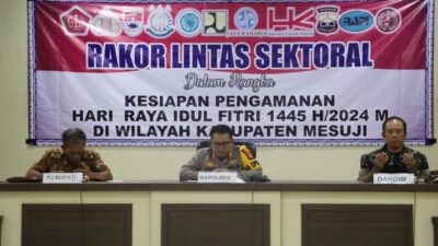 Mesuji |Pojokdesa.co.id : Polres Mesuji menggelar Rapat Koordinasi Lintas Sektoral dalam rangka kesiapan pengamanan Hari Raya Idul Fitri 1445 H Tahun 2024 di Wilayah Hukum Polres Mesuji, Senin (01/04/2024) Kapolres Mesuji AKBP Ade Hermanto S.H, S.IK, CPHR, yang hadir memimpin rapat menjelaskan bahwa kegiatan tersebut bertujuan untuk menyamakan persepsi dalam rangka kesiapan jelang Operasi Ketupat Krakatau 2024. “Koordinasi dan sinergitas dengan semua pihak sangat penting dalam bekerja sama dalam menghadirkan rasa aman dan nyaman bagi masyarakat, khususnya jelang perayaan Hari Raya Idul Fitri”. Ungkapnya Operasi Ketupat Krakatau 2024 akan dilaksanakan selama 13 hari, terhitung mulai Tanggal 4 sampai dengan 16 April 2024 dengan melibatkan personel Polres Mesuji dan Polsek Jajaran, serta gabungan Instansi terkait. Dalam pelaksanaannya, Polres Mesuji akan mendirikan 5 Pos yang terdiri dari 3 Pos pengamanan dan 2 Pos pelayanan. Lanjut Terang Alumni Akpol 2002 “3 Pos pengamanan tersebut diantaranya Pos pam Perbatasan Mesuji dengan Tulang Bawang Barat, Perbatasan Mesuji Lampung dengan Provinsi Sumsel dan Exit Tol Simpang Pematang, sedangkan untuk 2 Pos Pelayanan terdiri dari Pos pelayanan Simpang Pematang, dan Rest Area 234”. Imbuhnya Orang nomer satu di Mapolres itu berharap dengan persiapan yang matang kedepannya semoga angka kecelakaan dan kriminalitas menurun dari tahun sebelumnya, serta dapat memberikan rasa aman, tertib dan nyaman bagi Masyarakat yang merayakan Idul Fitri. Pungkasnya. Turut hadir dalam kegiatan ini, Kapolres Mesuji AKBP Ade Hermanto, S.H, S.I.K., CPHR, Pj. Bupati diwakili oleh Staff Ahli Bidang Pemerintahan dan Politik Samijo, Dandim 0426/TUBA diwakilkan Danramil 426-01/SP Mayor Inf Sutoto, Wakapolres Mesuji Kompol Juli Sundara S.pd, Kabag Ops. Polres Mesuji Kompol Iwan Dharmawan S.H, M.H, Kepala Kemenag Kab. Mesuji H. Johan Yusuf, S.Ag.M.,Pd.I, Kepala Dinas Perhubungan Kab. Mesuji Ronal Nasution, S.STP, Plt. Kadis PUPR Kab. Mesuji Ir Agnatius Syahrizal ST, MT, IPP, Kadis Kesehatan Kab. Mesuji Sunandar SKM, Kepala Dinas Pemuda, Olahraga dan Pariwisata Elvita Krisna wati, SE.,M.M, Kasat Pol PP Kab. Mesuji Drs Widada, MM, Kepala BPBD Kab. Mesuji Budiman Nainggolan, SKM., M.M, Kadis Damkar Kab. Mesuji Yanuar Fitrian, SKM.,M.M, Ketua MUI dan FKUB Kab. Mesuji H.M Husni Fadil S.Pd.I, Kadishub Kab. Mesuji diwakili oleh Sekretaris Anton SE, Para Kapolsek / Subsektor Polres Mesuji, Para Pejabat Utama Polres Mesuji, Ketua APDESI Kab. Mesuji, Camat Se-Kab. Mesuji, Branch Manager HK Tol Terpeka Yoni Satyo Wisnu wardhono, Jasa Raharja Cabang Kotabumi Akas, Ketua Senkom Kab. Mesuji Hi. Ma’ruf, Ketua RAPI Kab. Mesuji Suyadi, Ketua Pramuka Kab. Mesuji Syamsudin, S.Sos dan Pengusaha/ Pengelola SPBU se Kab. Mesuji.