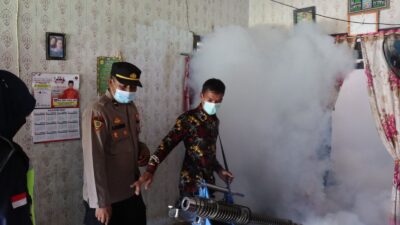 Mesuji | Pojokdesa.co.id : Dalam rangka mencegah dan menanggulangi merebaknya Wabah Demam Berdarah (DBD) di Kabupaten Mesuji, Jajaran Polres Mesuji bersama Pemerintah Daerah dan Masyarakat melakukan Fogging di rumah rumah Warga.