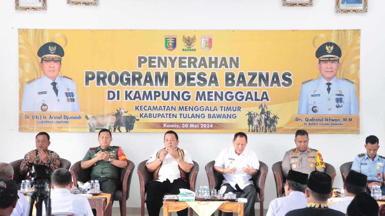 “Saat berada di kantor APDES Tulang Bawang, Gubernur Lampung melaksanakan kegiatan berupa penyerahan Program Desa Baznas sektor peternakan kepada 35 kepala keluarga (KK) yang ada di Kampung Menggala. Bantuan yang diserahkan berupa 155 ekor kambing,” kata perwira peraih Adhi Makayasa Akpol 2004.