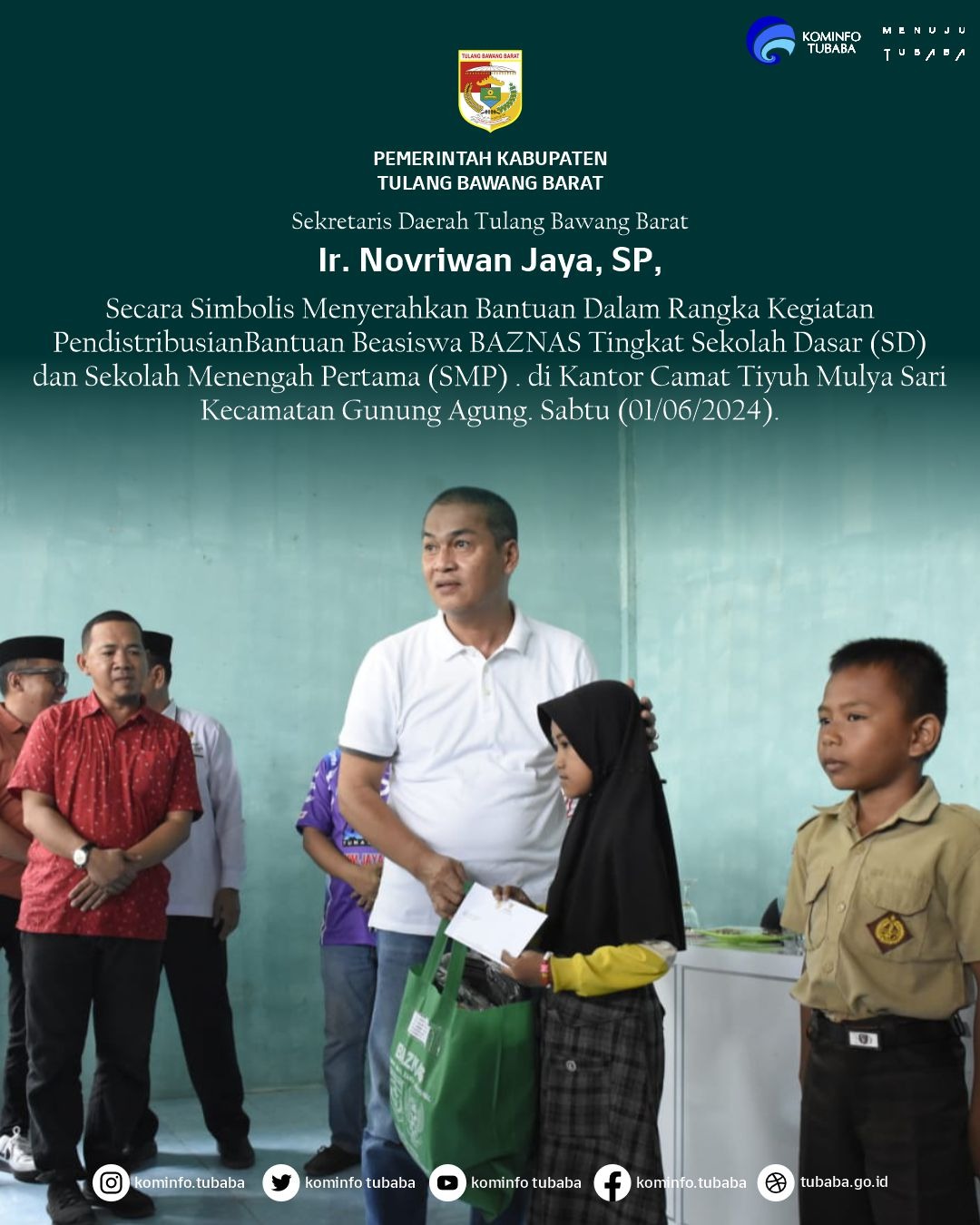 TUBABA | Pojokdesa.co.id : Sekretaris Daerah (sekda) Tubaba Ir. Novriwan Jaya. SP, Secara Simbolis Menyerahkan Bantuan Dalam Rangka Kegiatan Pendistribusian Bantuan Beasiswa BAZNAS Tingkat Sekolah Dasar (SD) dan Sekolah Menengah Pertama (SMP)