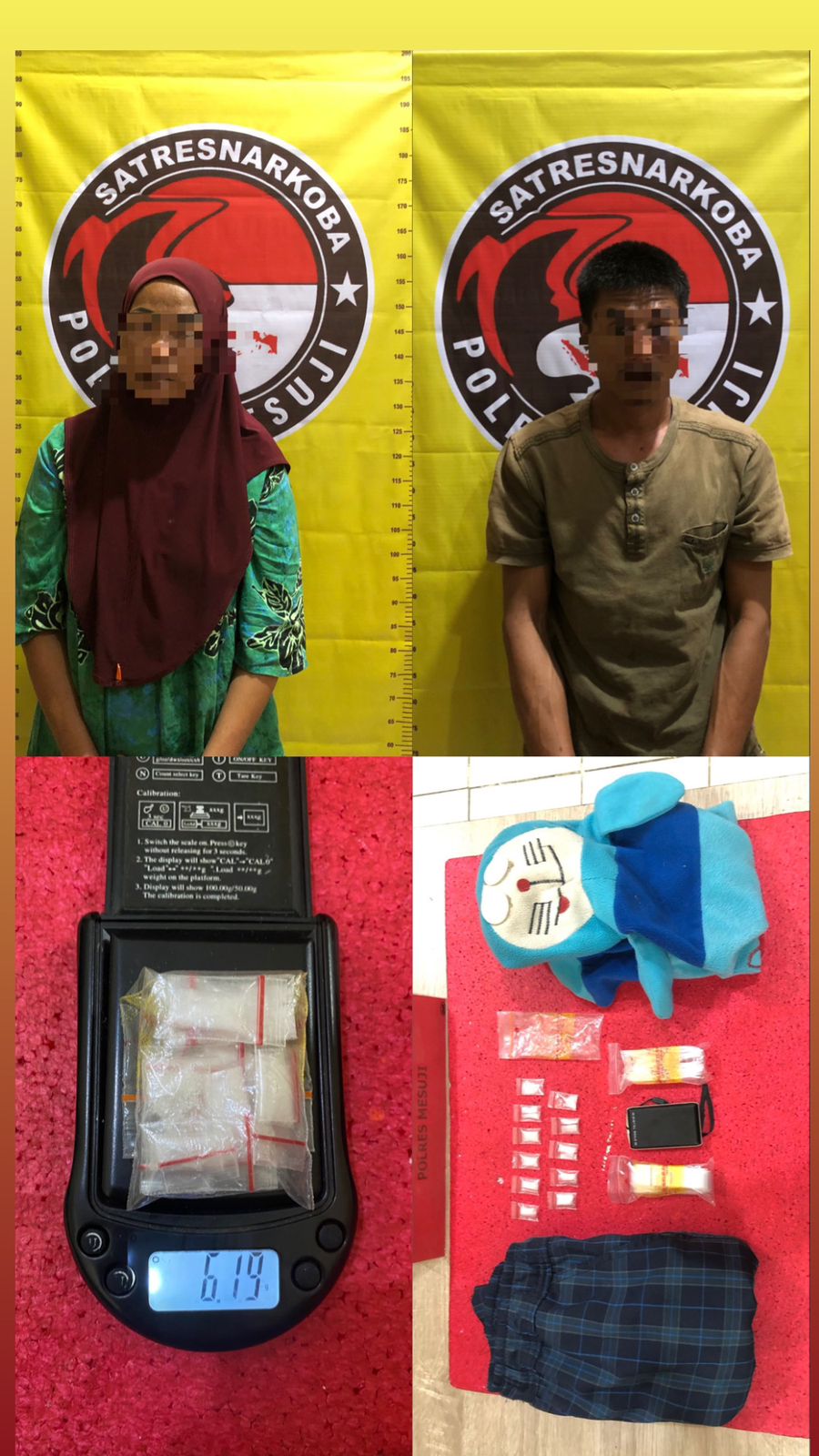 Kemudian Anggota Sat Res Narkoba Polres Mesuji melakukan penangkapan terhadap 2 (dua) orang, Laki-Laki dan Perempuan lalu dilakukan pengeledahan di dalam rumah Tersangka, dan ditemukan barang bukti berupa 11 (sebelas) buah plastic klip kecil yang didalamnya masing-masing berisi 1 (satu) buah plastic klip kecil berisi narkotika jenis shabu dengan berat 6,22 (enam koma dua puluh dua) gram, 2 (dua) buah plastic klip yang didalamnya masing- masing berisi 100 (seratus) plastic klip kecil, di dalam saku celana pendek warna biru dengan motif kotak-kotak, 1 (satu) buah bantal warna biru dengan bentuk doraemon dan 1 (satu) buah timbangan digital. Imbuh Kasat Narkoba