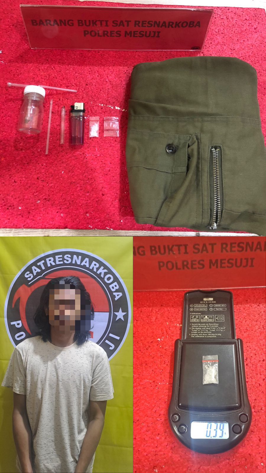 Dan di temukan Barang Bukti 1 buah plastic klip kecil berisi narkotika jenis shabu dengan berat bruto 0,39 gram didalam saku celana, 1 (satu) plastic klip kecil sisa pakai, 1 (satu) buah korek api gas, 1 (satu) buah kaca pirek, 1 (satu) buah alat hisap/bong yang terbuat dari botol plastic yang diujung tutupnya terdapat 2 (dua) buah pipet plastik yang sudah dibengkokkan, 1 (satu) buah pipet plastic, 1 (satu) buah celana pendek berwarna hijau. Tegas Iptu Andy