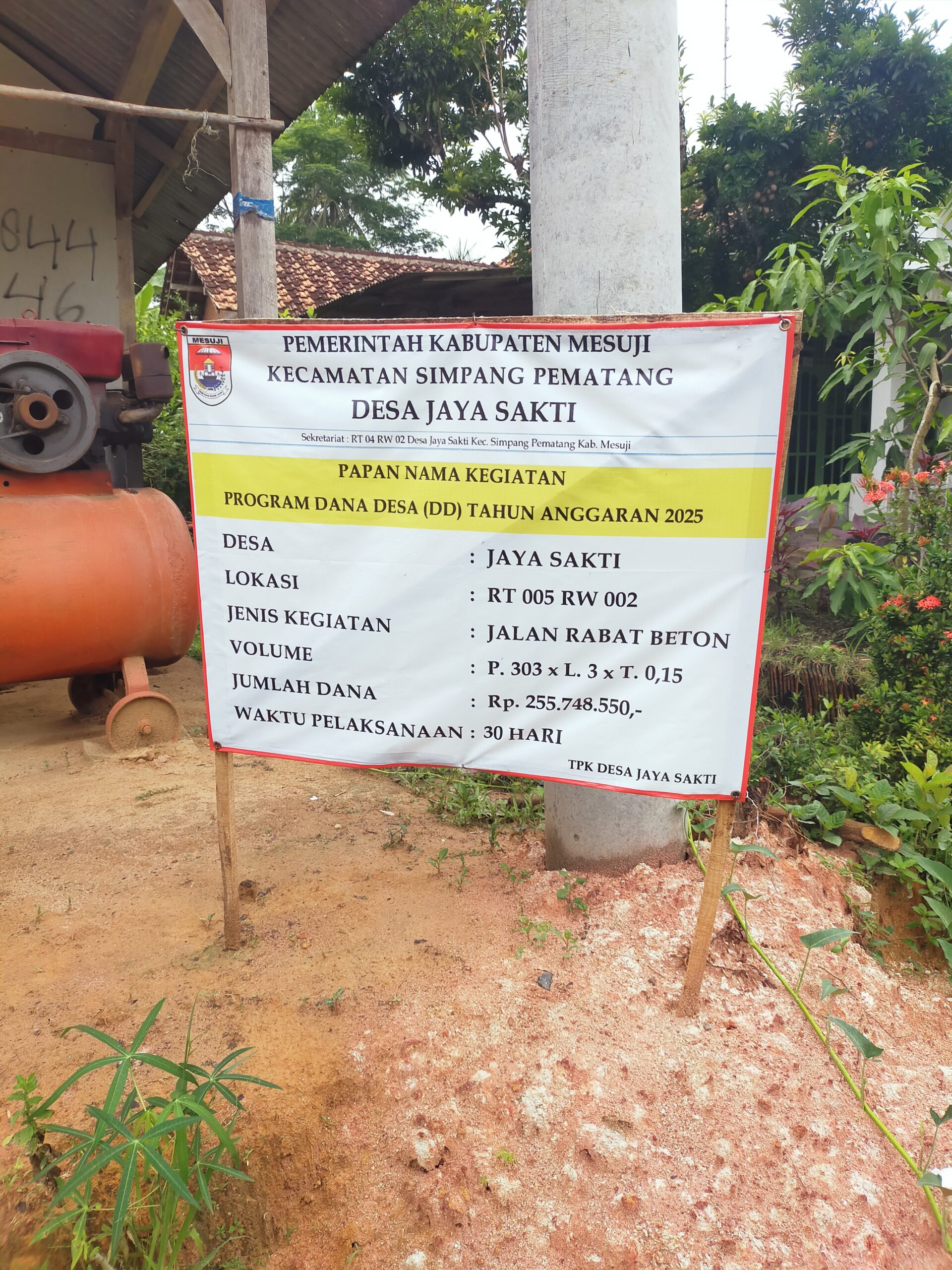 Mesuji | Pojokdesa.co.id : Pembangunan jalan rabat beton yang ber sumber dari Dana desa (DD) th 2025 tahap ke satu desa Jaya sakti kecamatan Simpang pematang kabupaten Mesuji sudah di realisasikan,adapun jalan rabat beton yang akan di bangun tersebut terletak di Rk 02 Rt 05 dengan ukuran atau dimensi P : 303 meter, L : 3 meter dan T:0,15 cm , pelaksanaan selama 30 hari dengan pagu anggaran sebesar Rp 255.748.550 ,-.